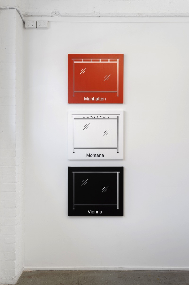 The images in these paintings are derived from a balustrade and fencing catalogue. With such arbitrary names and designs, the whole thing feels like a kind of semiological test. The fact that the “Manhatten” design has been misspelt is the first clue.
