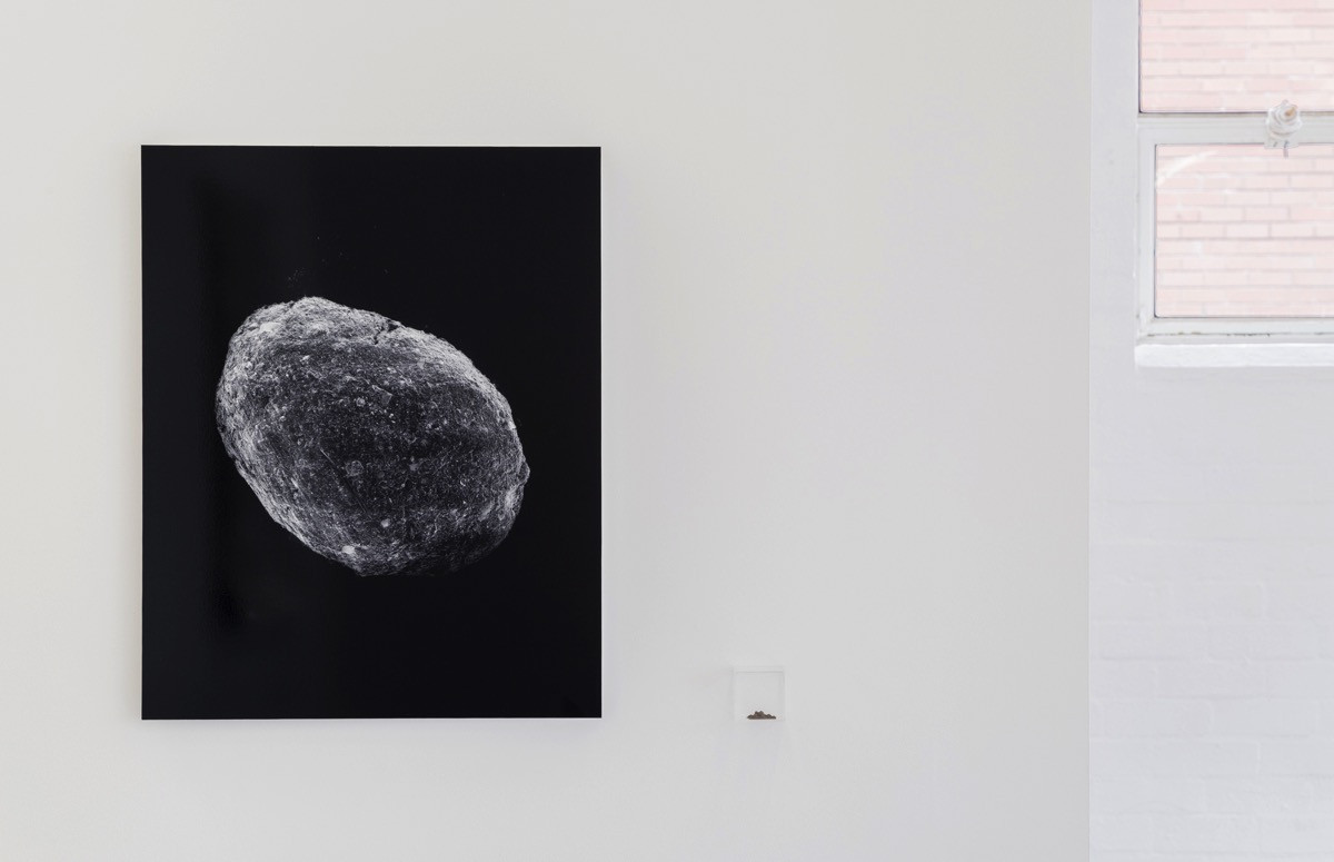 ‘Sediment’, deepens Griffith’s material investigations into the geological substrate. Grinding electronic waste material procured from landfill into particle form, Griffiths then submitted the amalgam to heat and compression, manually fast-tracking their geological transformation underground. Employing a Scanning Electron Microscope, he render’s these new compounds visible to the viewer, magnifying the encrusted surface of a single particle composed of oxygen, silicon, lead, magnesium, aluminium, carbon, iron, titanium, potassium, sodium, and calcium. The resulting image captures a moment in the human co-production of ‘nature’.