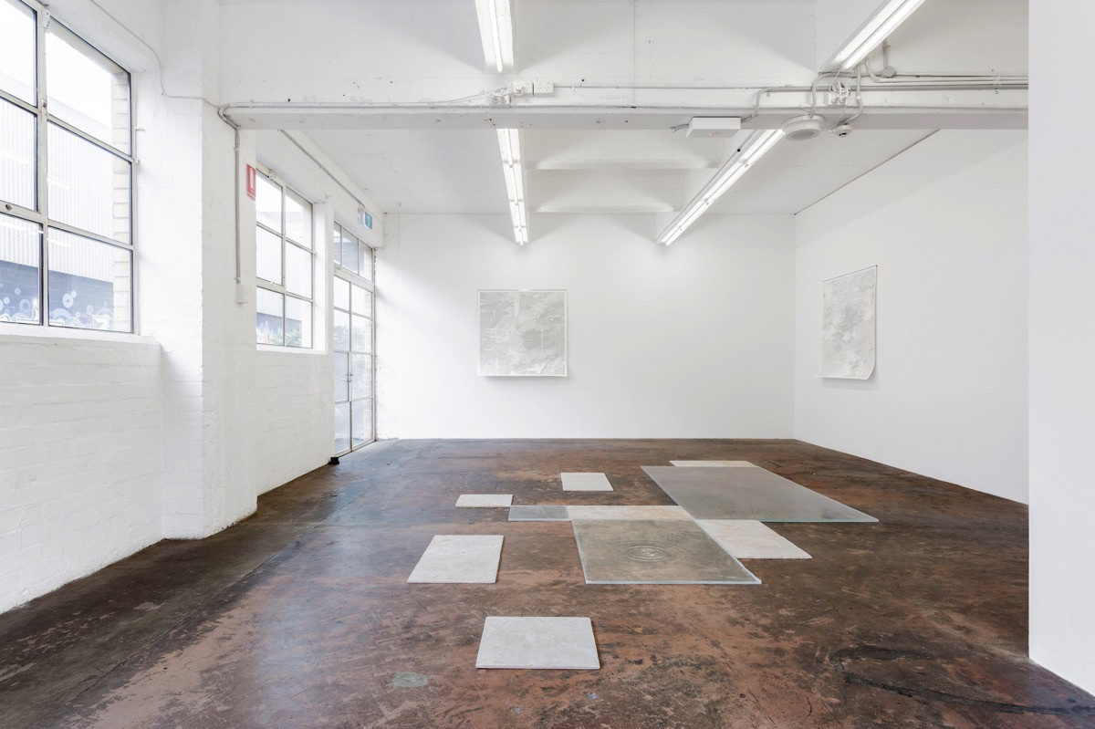 Griffith’s ‘Fountains’ focus on the geological formation of Travertine, a terrestrial sedimentary rock formed by the precipitation of carbonate minerals in ground and surface waters. Through this material investigation, Griffiths re-articulates the historic fountain as an ecosystem where cycles of growth and decay constantly transform these monuments to our most precious natural resource. Griffiths’ elemental reduction of the fountain, to an almost invisible basin and a few roof leaks within the gallery, alongside the travertine tiles, dispersed around the water catchments mark both momentary and deep time.