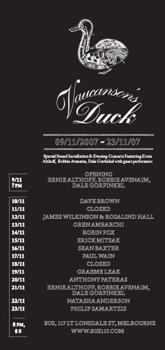 Vaucanson’s Duck brings together, for the first time, three unique instrument builders and sonic thinkers to construct a special sound installation and series of concerts at Bus. ERNIE ALTHOFF, ROBBIE AVENAIM and DALE GORFINKEL will provide a site-specific collaboration utilising their diverse array of wondrous automated music inventions, continuously challenging and mesmerising audiences both sonically and visually.
